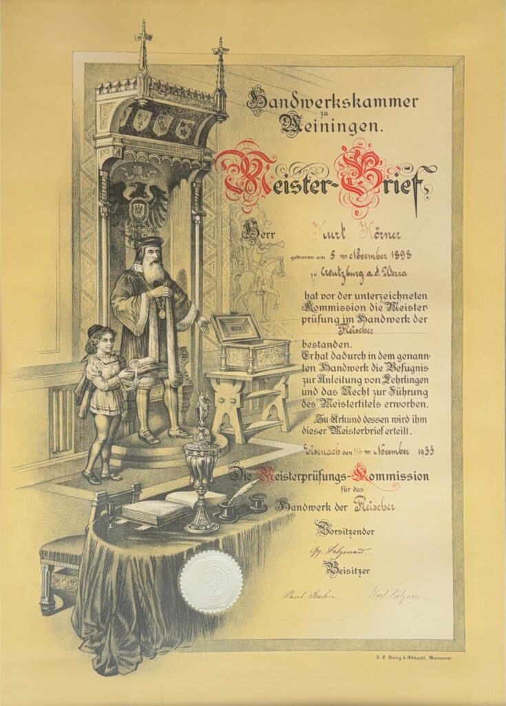 Am 14.11.1933 legte Kurt Körner mit Erfolg seine Meisterprüfung im Fleischer Handwerk ab und ist somit berechtigt die Fleischerei zu führen und Lehrlinge in diesem Beruf auszubilden.