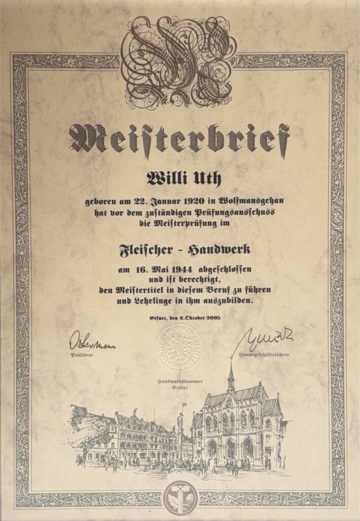 Am 16.05.1944 legte Willi Uth mit Erfolg seine Meisterprüfung im Fleischer Handwerk ab und ist somit berechtigt die Fleischerei zu führen und Lehrlinge in diesem Beruf auszubilden.