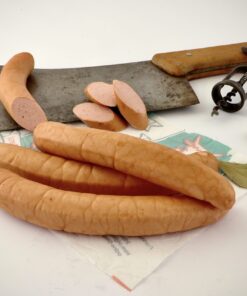 56% Schweinefleisch, Speck, 30% Rindfleisch, Trinkwasser, Siede-Nitrit-Pökelsalz, Gewürze, Speisewürze (Sojaeiweiß), Phosphat, Glutamat, Antioxidationsmittel, Darm (Schwein), Buchenrauch