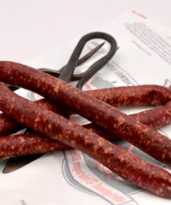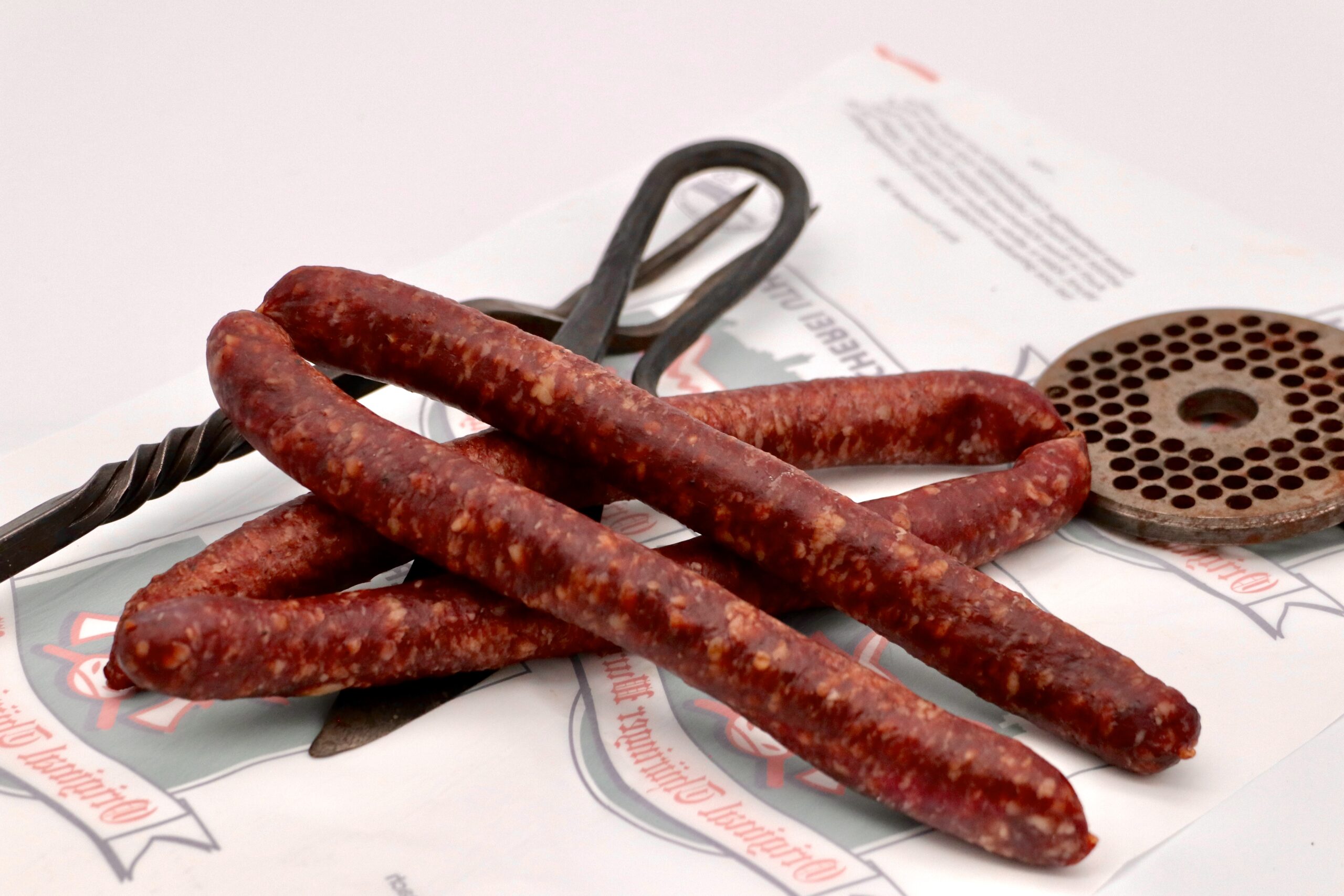Rindfleisch, Rinderfett, Gewürze, Siede-Nitrit-Pökelsalz,E250, Kristallzucker, Starterkulturen, Schafsaitling, Buchenrauch