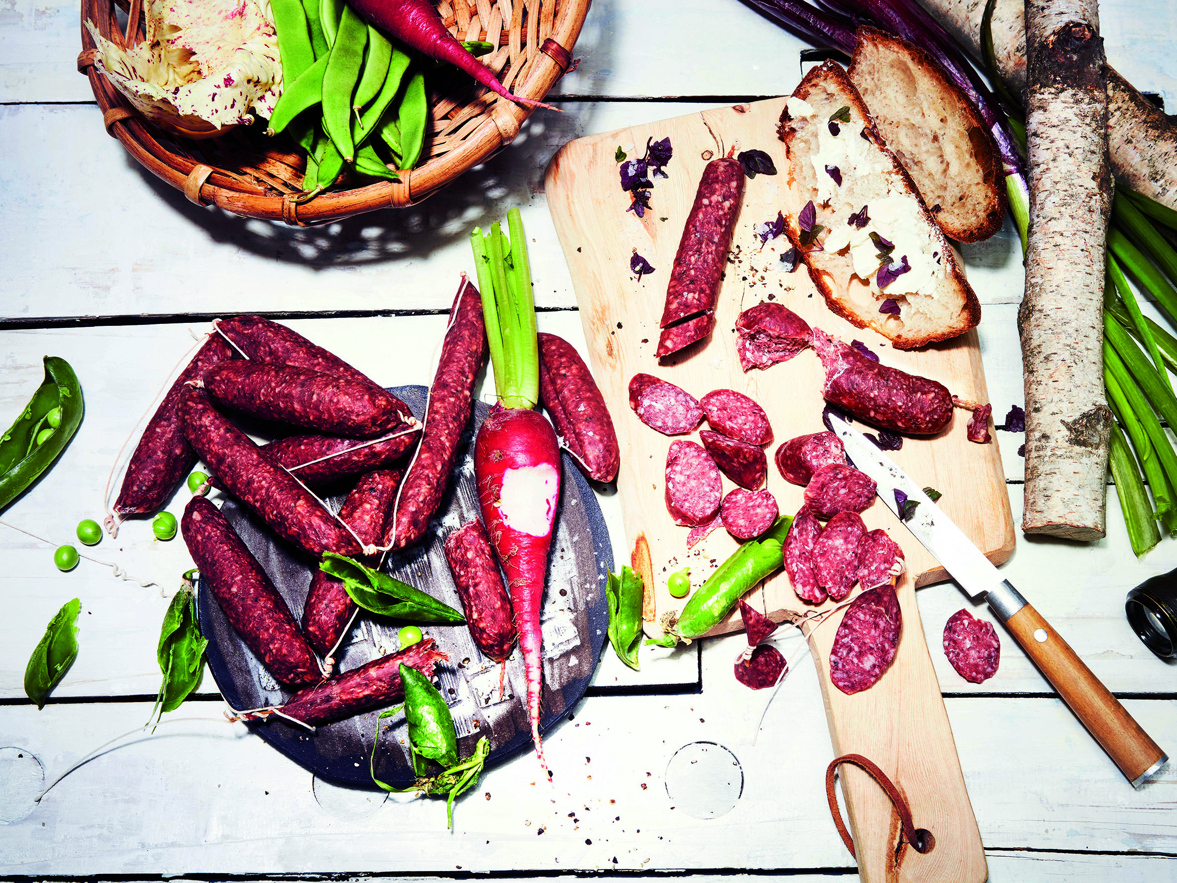 Mit Wildschweinfleisch aus freier Wildbahn und Schweinefleisch aus der Offenstall-Haltung hergestellt, mit eigener Gewürzmischung, grobem Tellicherry Pfeffer und Knoblauch abgestimmt. Im rustikal gebundenen Naturdarm nach einem besonderen Naturreifeverfahren gereift und über Buchenrauch mild geräuchert, mittelgrob gekörnt. www.offenstall.com