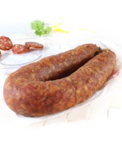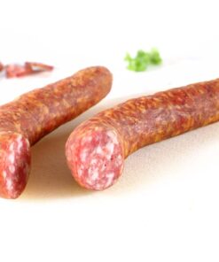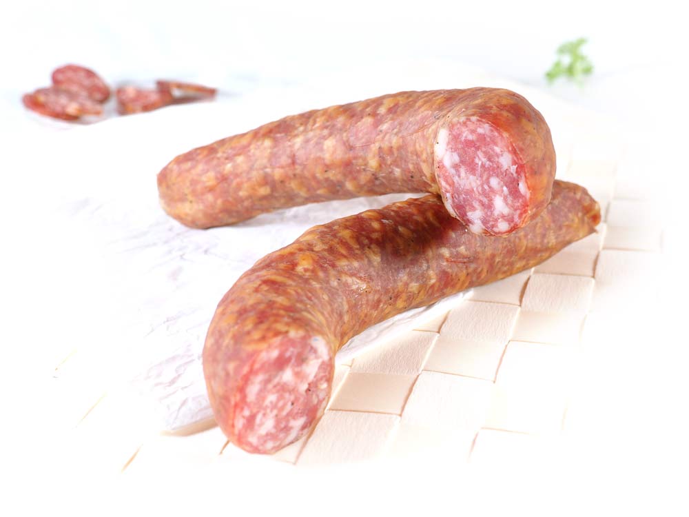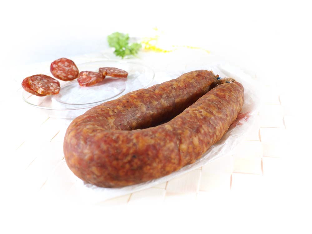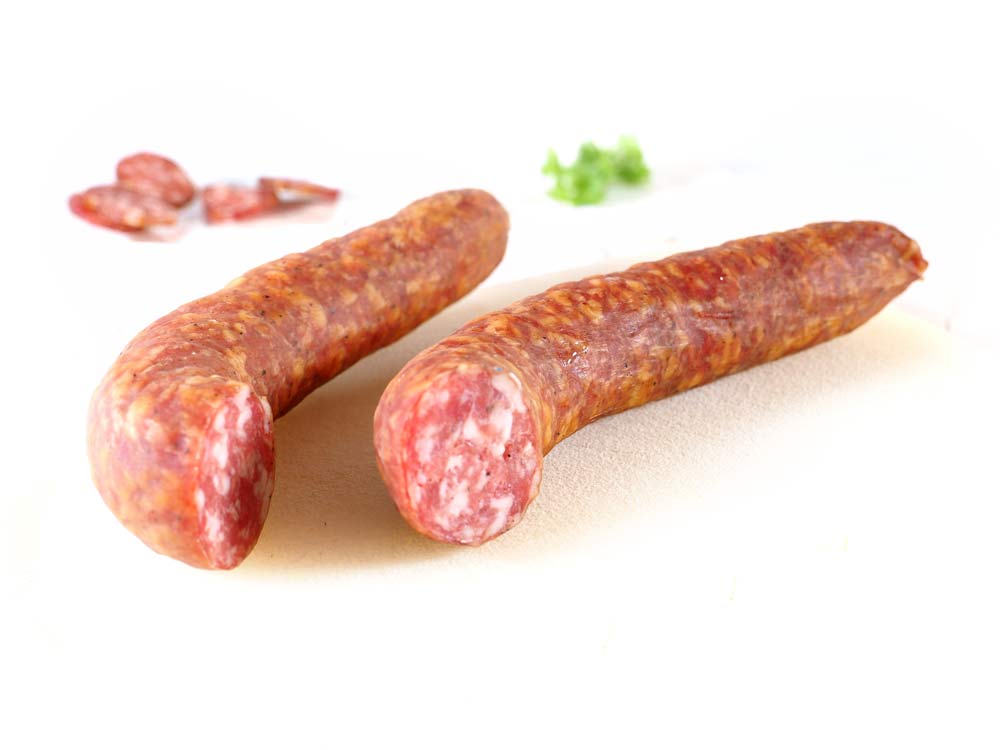 85% Schweinefleisch, Speck, Siede-Nitrit-Pökelsalz (Konservierungsstoff), Gewürze, Dextrose, Starterkulturen, Schweinedarm, Buchenrauch