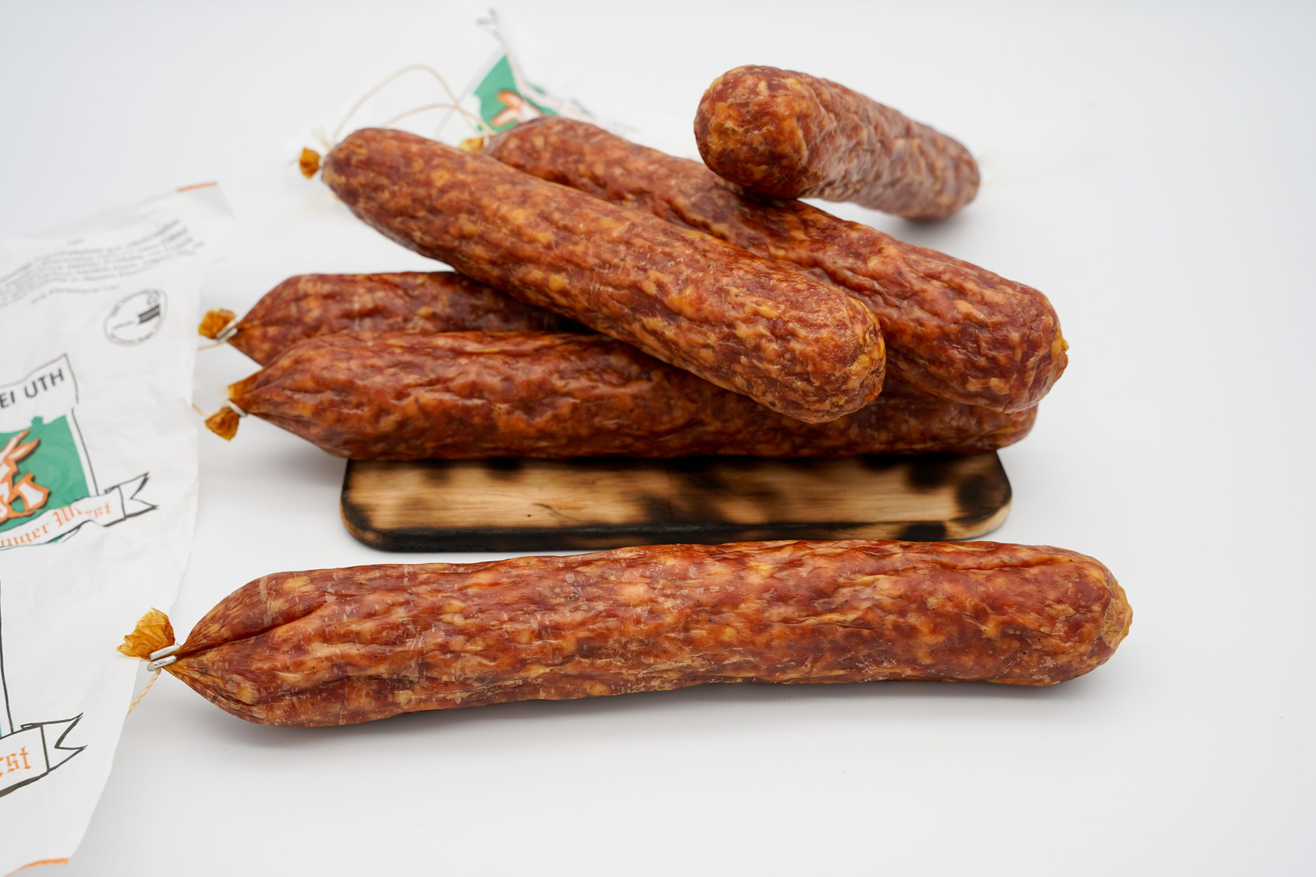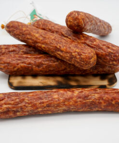 85% Schweinefleisch, Speck, Siede-Nitrit-Pökelsalz (Konservierungsstoff), Gewürze, Naturdarm, Buchenrauch